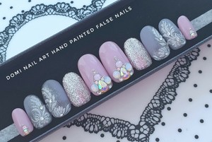 Hand Painted False Nails Pink Gray Glitter Nail Art Diamonds